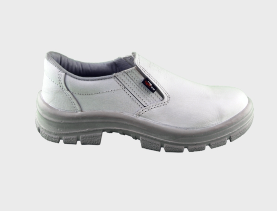 Sapato confeccionado em couro vaqueta lisa, cor branca, fechamento em elástico, sem biqueira, solado monodensidade injetado direto ao cabedal. (opcional biqueira de polipropileno).