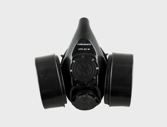 • Nas laterais do corpo da peça estão localizadas duas aberturas, uma de cada lado, nas quais são encaixados dois suportes plásticos pretos com rosca externa, em cada um destes, encaixa-se um filtro químico classe 1, preso ao suporte através de uma tampa de material plástico preto, com rosca interna;